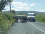 There are very few highways, as we know them here in the states. Most of what you will be driving are similiar to our two-lane backcountry roads, only more narrow. You will have hedges on each side of the road which usually hide stone walls, fences or a deep ditch. You will have steep mountsides or hedgerows on one side and nothing but cliffs and ocean on the other. You will encounter large lorries (trucks), tour buses, native drivers, pedestrians, sheep, cattle, bicyclists, large farming equipment, etc., which will slow you down if not stop you in your tracks. Drving in Ireland is somewhat more intense of an experience than it is here in the states. Just because road looks fairly direct on a map, you have to take in to consideration the small towns you will be driving through, losing your way or getting turned around (happens to the best of us), being sidetracked by the scenery, ruins, small shops, unexpected weather, traffic delays, etc.