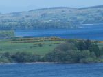 As I grabbed my camera and climbed out of Peg, the grey skies became a glorious blue with clouds scudding across. It was an easy walk to the Castle, just a few yards from where I parked. I stopped a few moments to chat with the cows in the adjoining pasture. They seemed most interested in my Cowboy 's Brawley. My good weather lasted about ten minutes. It then ended abruptly with a gust of wind and a gusher of rain. Back again to Peg and the dry interior. Onward through Ballinafad and to the Lough Arrow overlook.